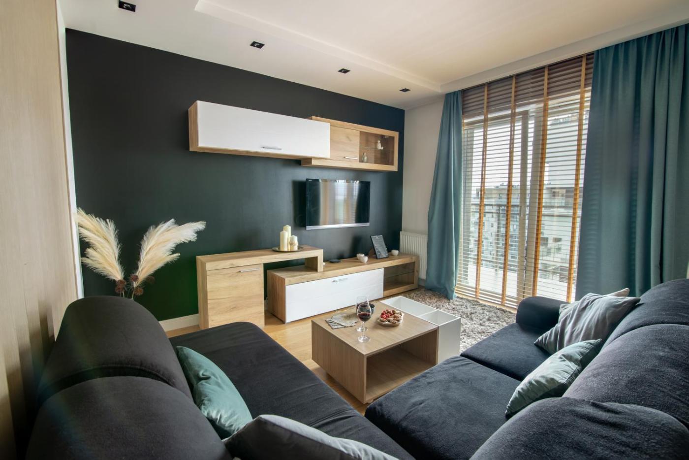 Apartament z 1 sypialnią. Boasting 1 bedroom and 1 bathroom with a shower, this apartment has a well-fitted kitchen and a terrace. The well-fitted kitchen has a stovetop, a refrigerator, kitchenware and an oven. The air-conditioned apartment features a flat-screen TV with cable channels, a washing machine, a tea and coffee maker, a wardrobe as well as city views. The unit offers 1 bed. Apartament - 2 osobowy. Powierzchnia pokoju ok.: 35 mkw.